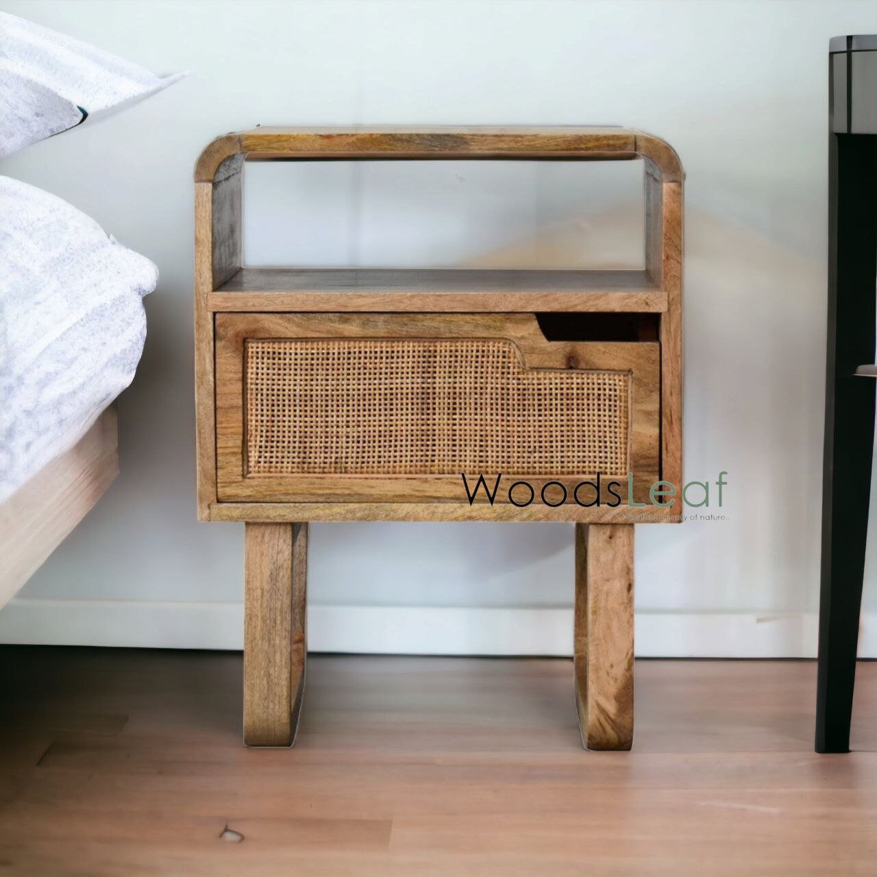 Handgefertigter Nachttisch/Nachttisch/Holzschublade aus natürlichem Rohrgeflecht, Heimdekoration, Mangoholz, natürliches Finish, indische Möbel