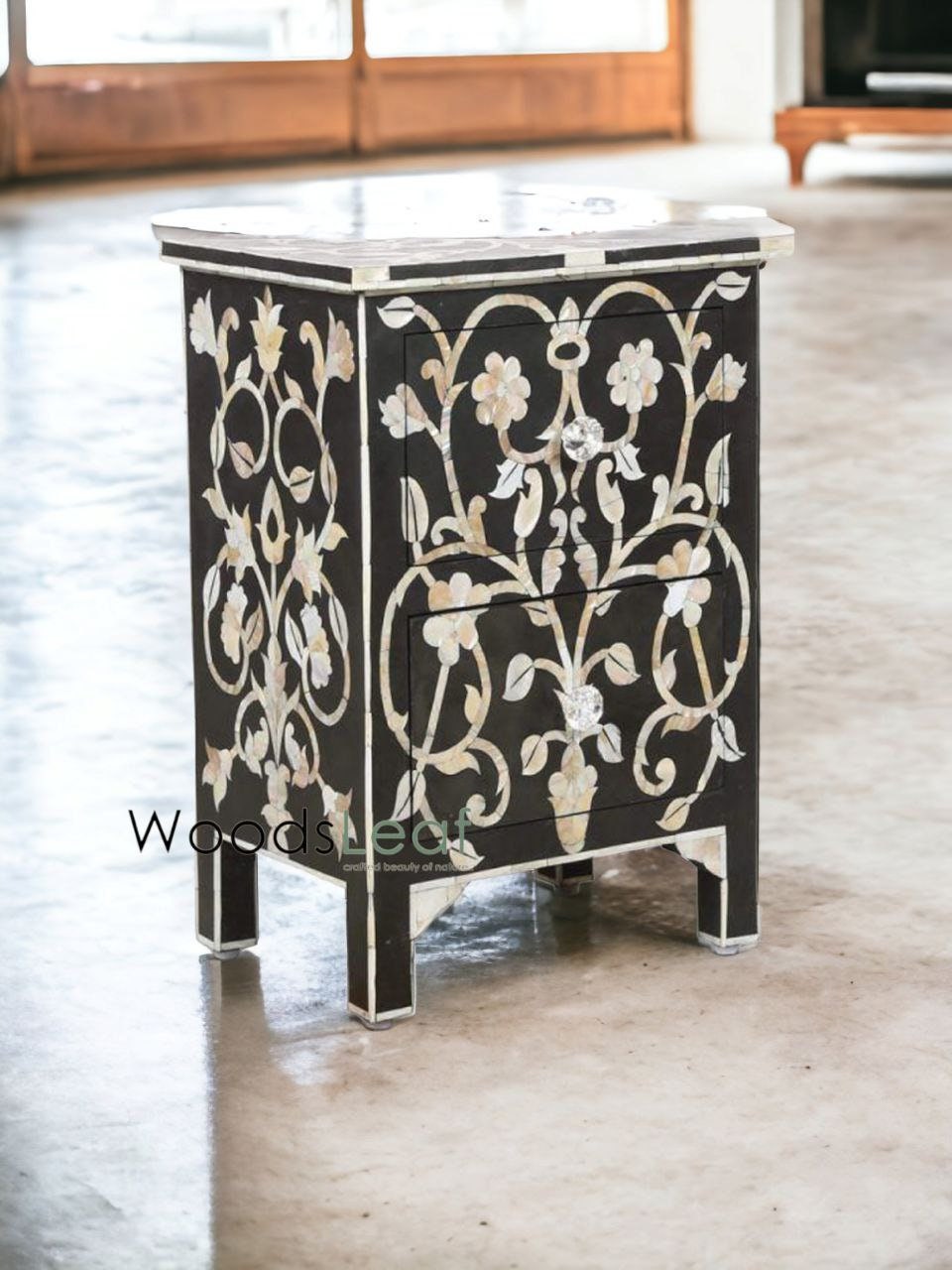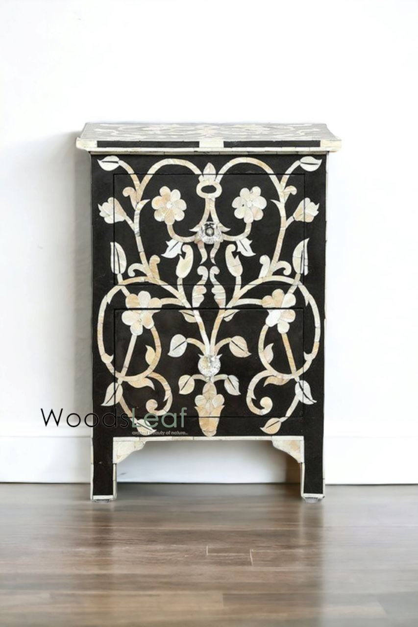 Chevet d’incrustation d’os 2 tiroirs, conception de fleur, table d’extrémité, table de nuit d’incrustation d’os, meubles d’incrustation d’os de table latérale d’incrustation