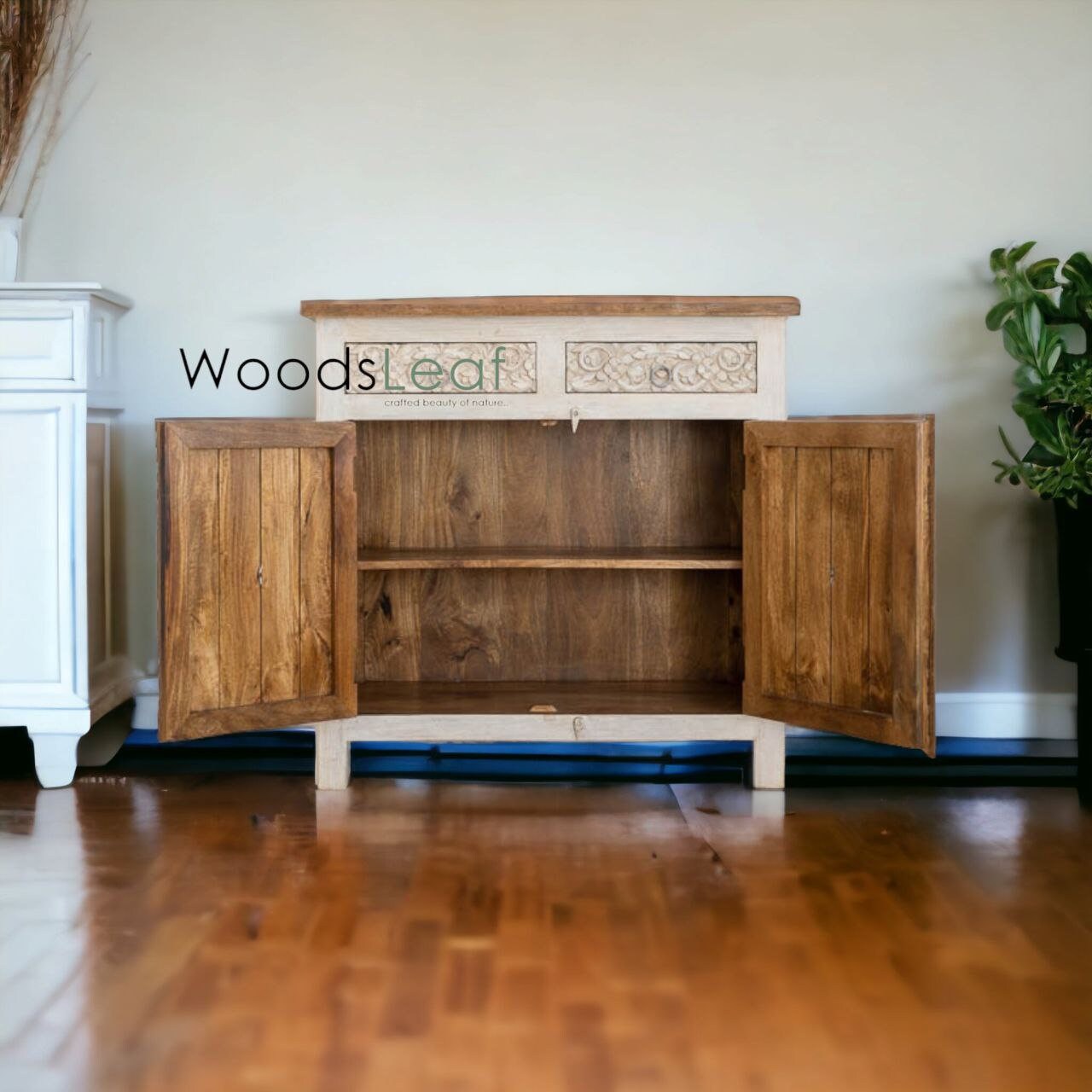 Présentation de notre exquis buffet en manguier sculpté à la main, un meuble intemporel qui allie savoir-faire traditionnel et fonctionnalités personnalisables. Fabriqué à partir de bois de manguier de haute qualité, ce buffet offre une durabilité exceptionnelle et une finition vieillie distinctive, ajoutant une touche de charme rustique à n'importe quel espace.