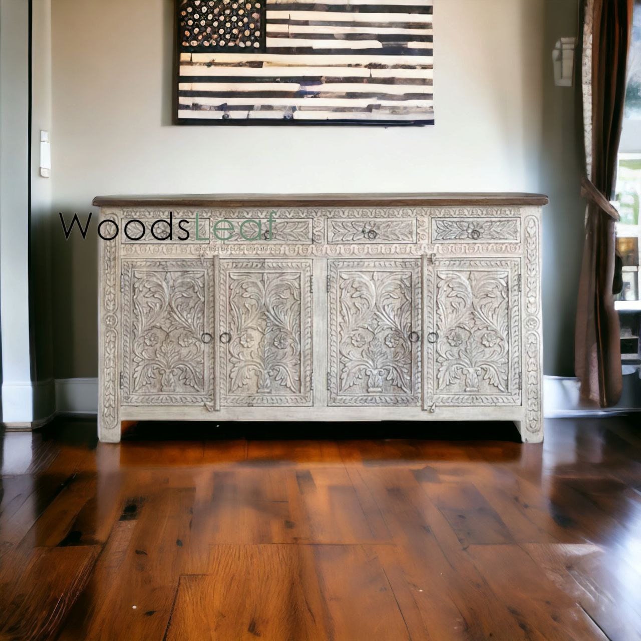 Non seulement la sculpture est personnalisable, mais la finition l’est aussi. Nos artisans talentueux peuvent adapter la finition de votre buffet à vos goûts personnels et à votre décoration intérieure. Que vous préfériez un aspect bois naturel, une riche teinture foncée ou une finition peinte aux couleurs vives, nous pouvons donner vie à votre vision.