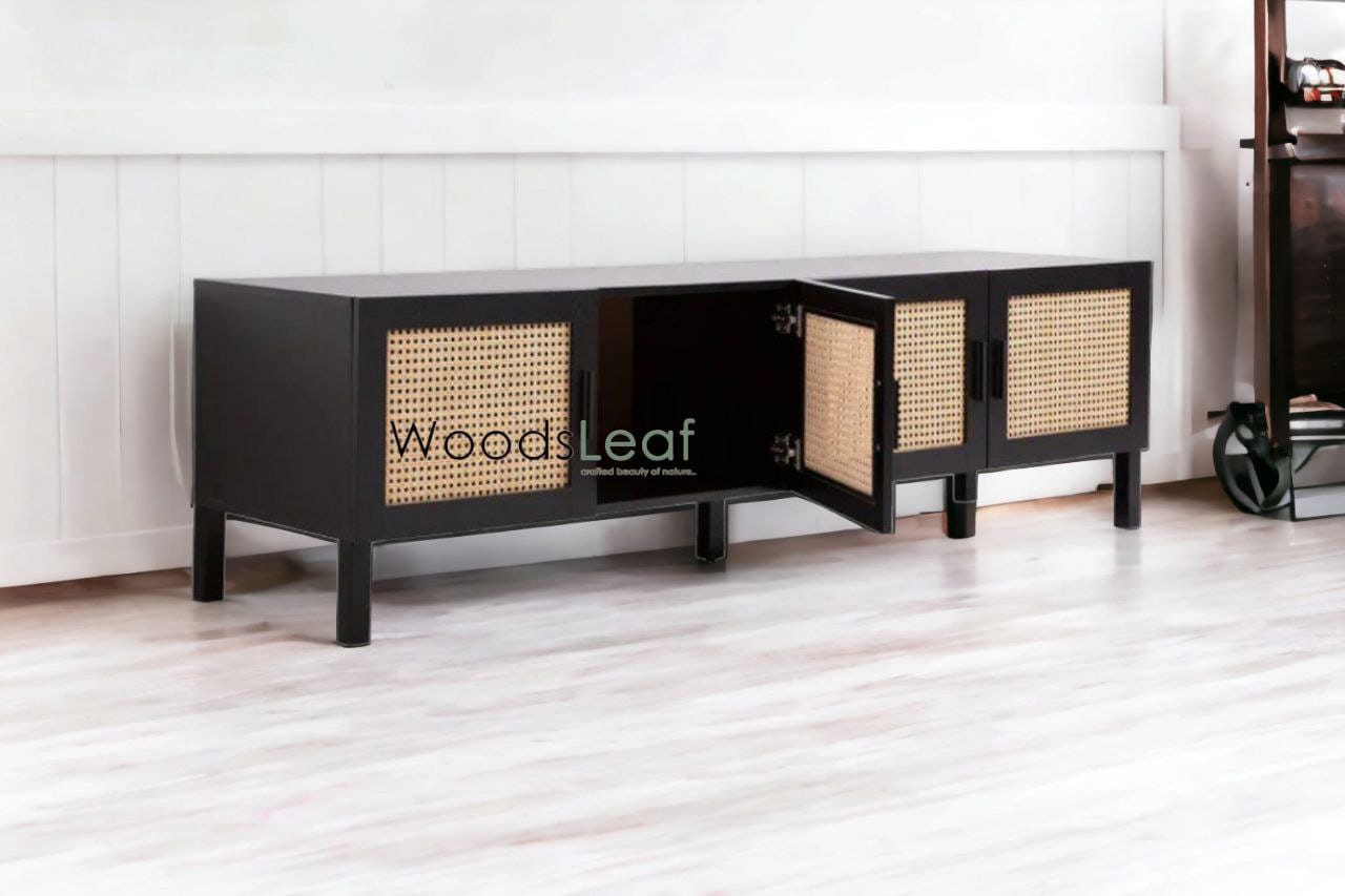 Console de télévision en canne naturelle faite à la main, porte en bois, décoration d'intérieur, bois de manguier, finition noire, meubles indiens/Tvc/unité TV