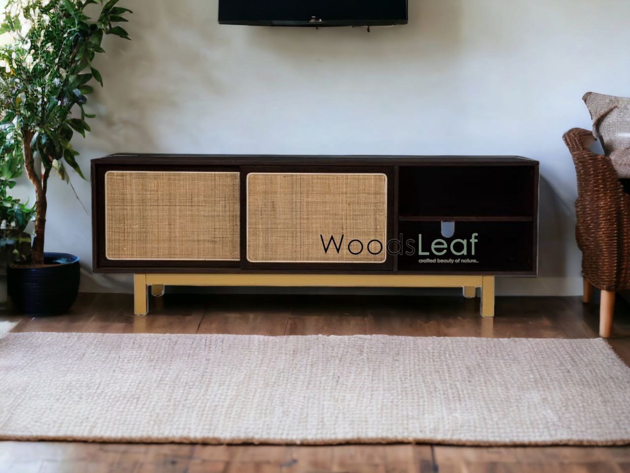 Console de télévision en canne naturelle faite à la main, porte en bois, décoration intérieure, finition en bois de manguier, meubles indiens/unité TV