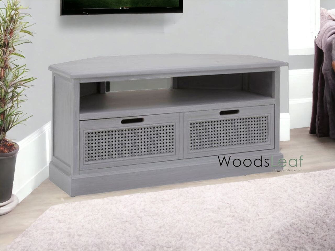 Console de télévision en canne naturelle faite à la main, porte en bois, décoration intérieure, finition grise en bois de manguier, meubles indiens/unité TV