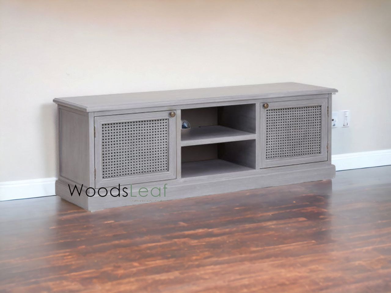 Console de télévision en canne naturelle faite à la main, porte en bois, décoration intérieure, finition grise en bois de manguier, meubles indiens/unité TV