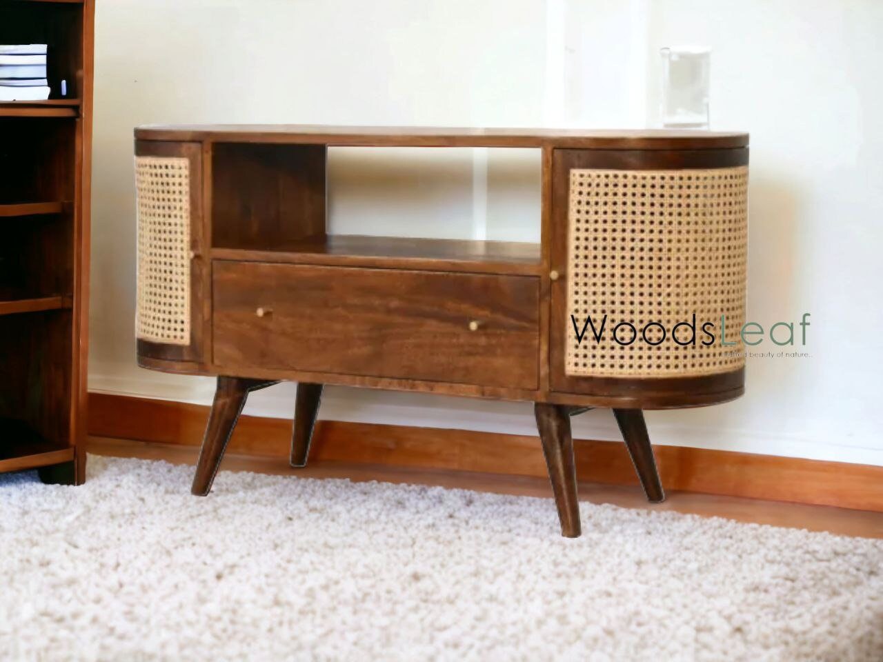 Console de télévision en canne naturelle faite à la main, porte en bois, décoration intérieure en bois de manguier, finition naturelle, meubles indiens/Tvc/unité TV