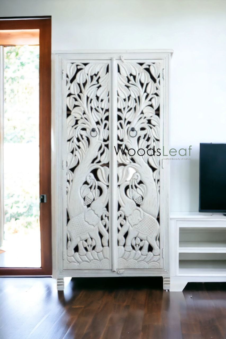 Armoire en bois massif antique vintage faite à la main, armoire sculptée, finition en détresse, armoire rustique sculptée, design blanc en détresse, 2 portes