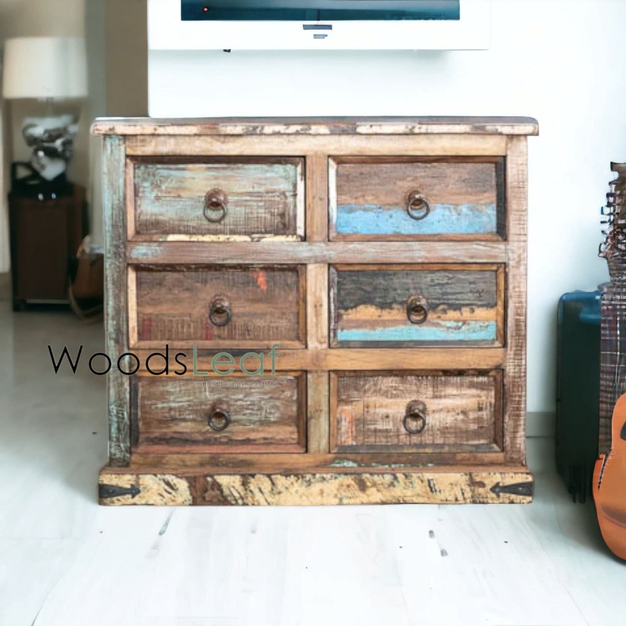 Buffet en bois fait à la main, unités de rangement d’armoires, finition en bois massif indien en détresse, meubles de chambre à coucher de salon, grand buffet 6 tiroirs