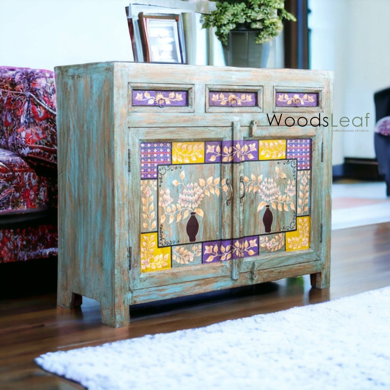 Finition vieillie en bois massif indien, meubles de chambre à coucher de salon, grand buffet, buffet en bois fait à la main, conceptions de fleurs d’armoire
