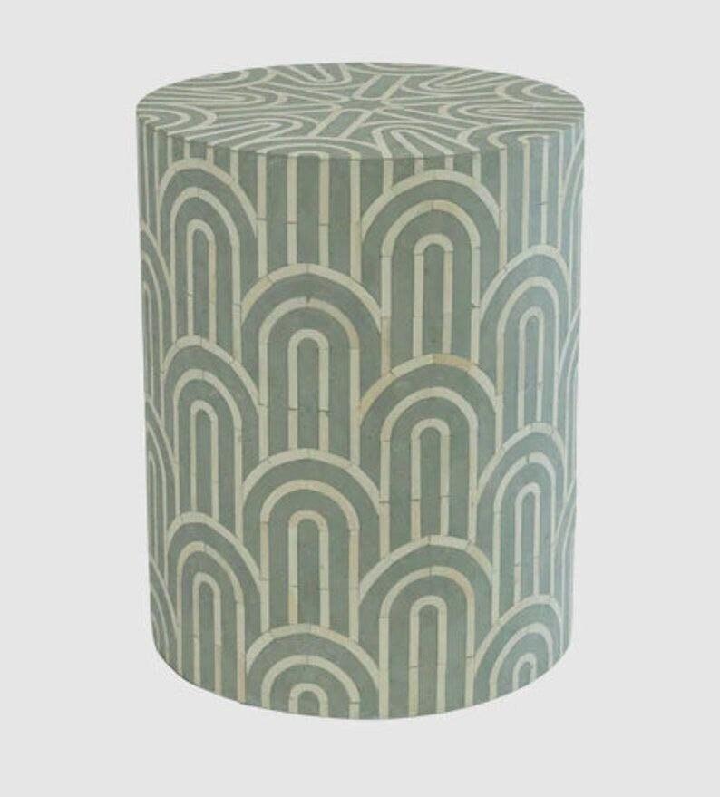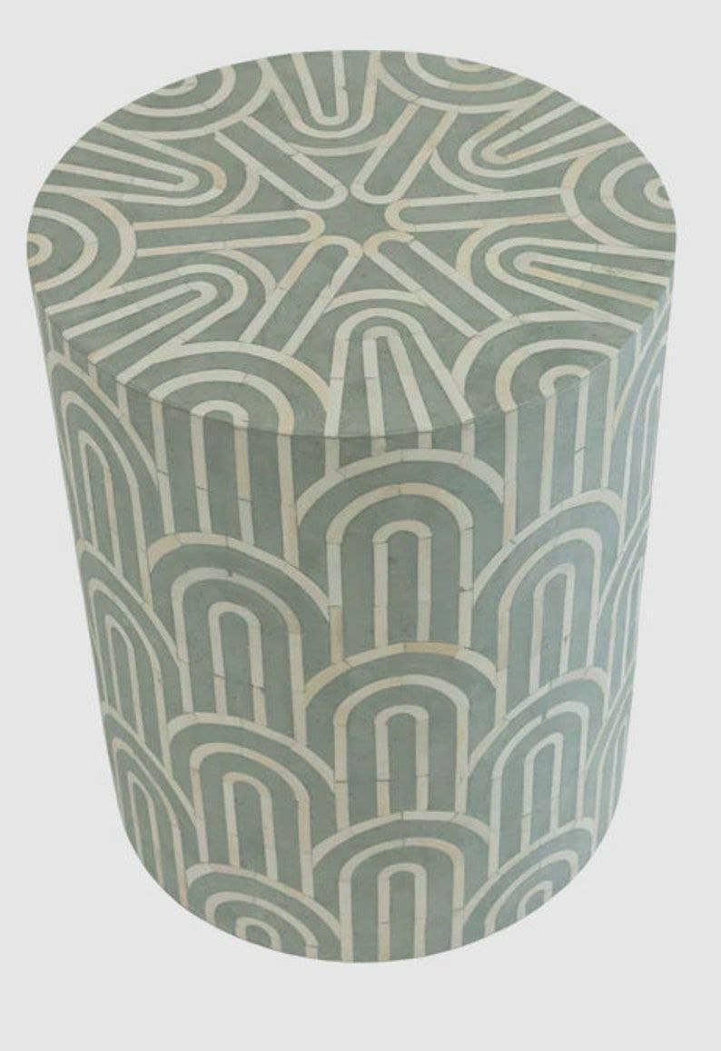The light grey resin finish adds a touch of sophistication, enhancing the intricate details of the bone inlay while providing a smooth and lustrous surface. This table not only serves as a functional piece of furniture but also stands as a statement of artistic craftsmanship.