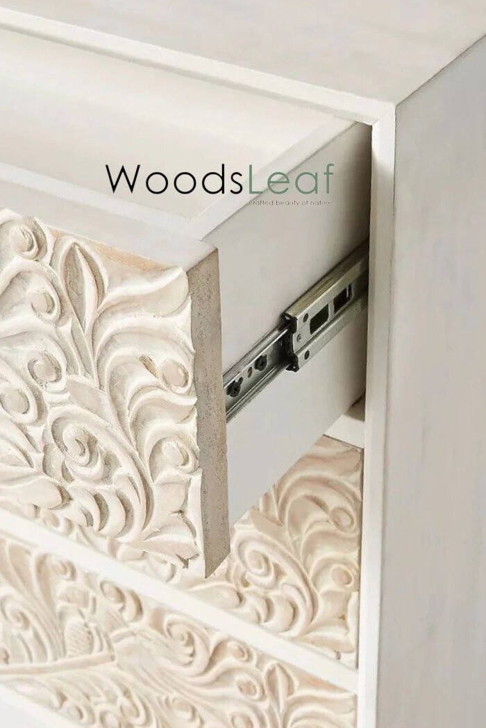 Hand-Carved Wooden Handles: Accentuating the drawers are beautifully hand-carved wooden handles, mirroring the intricate design elements found throughout the piece. These handles not only serve a functional purpose but also enhance the overall aesthetic appeal, creating a cohesive look.