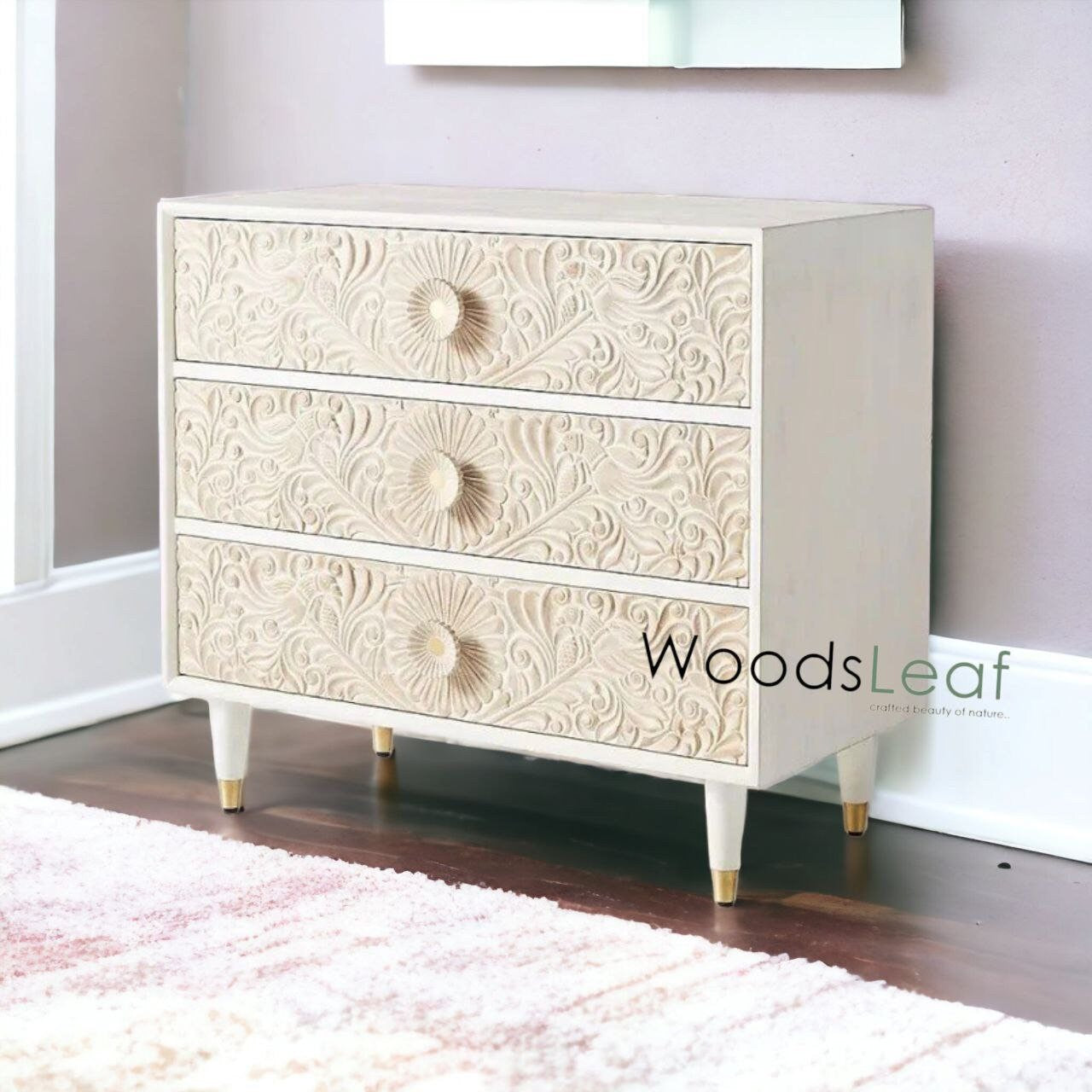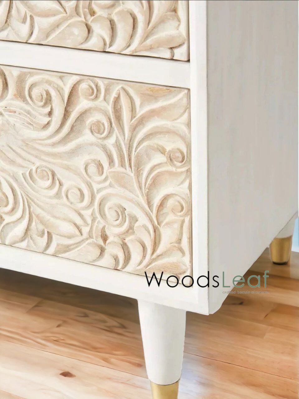 Elevate your living space with this exquisite chest of drawers, meticulously crafted from solid mango wood renowned for its durability and rich grain patterns. Each piece showcases the inherent beauty of natural wood, enhanced by a hand-carved design that speaks volumes of artisanal craftsmanship.