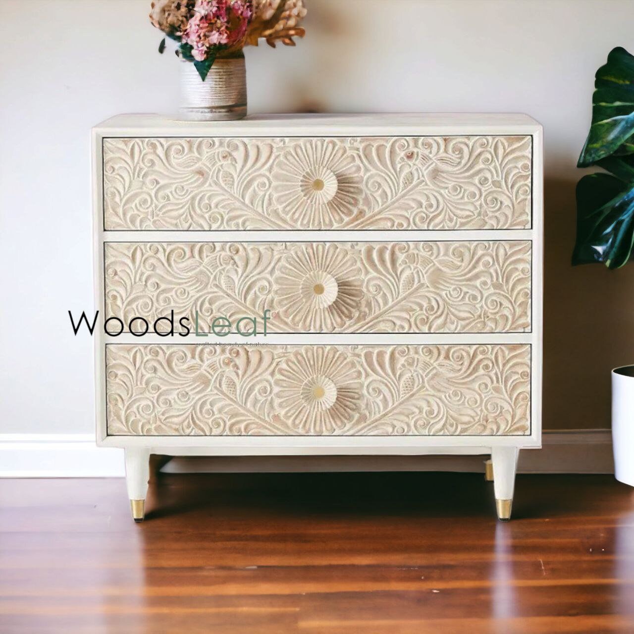 Solid Mango Wood Chest of Drawers with Hand-Carved Design