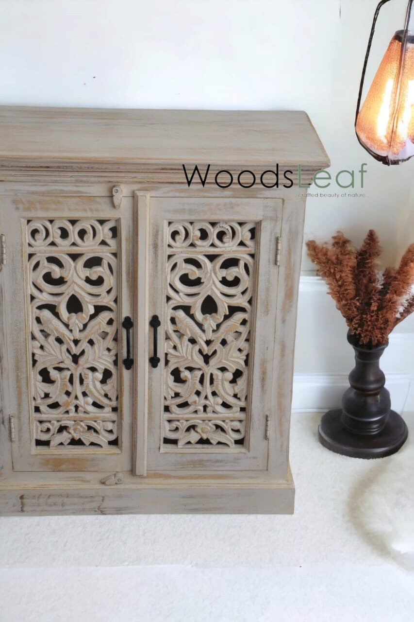 Incorporating a blend of craftsmanship, functionality, and aesthetic appeal, this solid mango wood cabinet with hand-carved designs serves as a statement piece in any interior setting. Whether you appreciate its intricate detailing, spacious storage options, or distressed finish, this cabinet is sure to captivate attention and elevate your décor.
