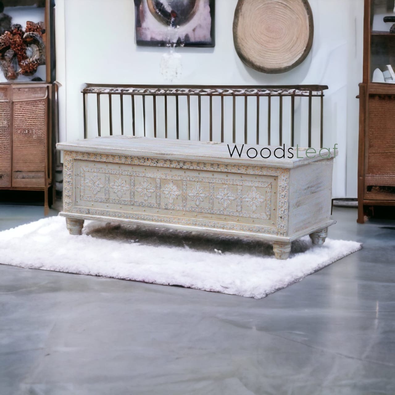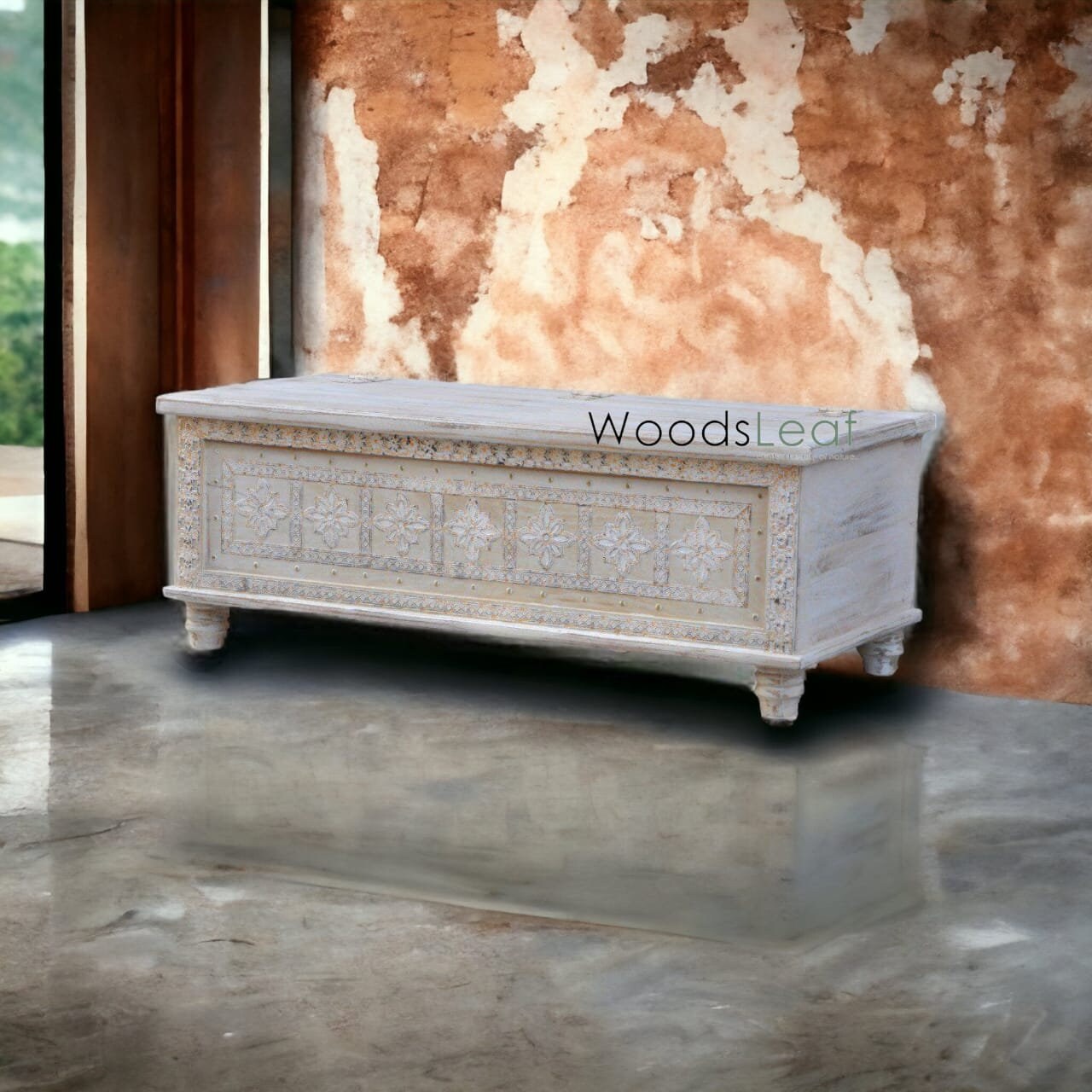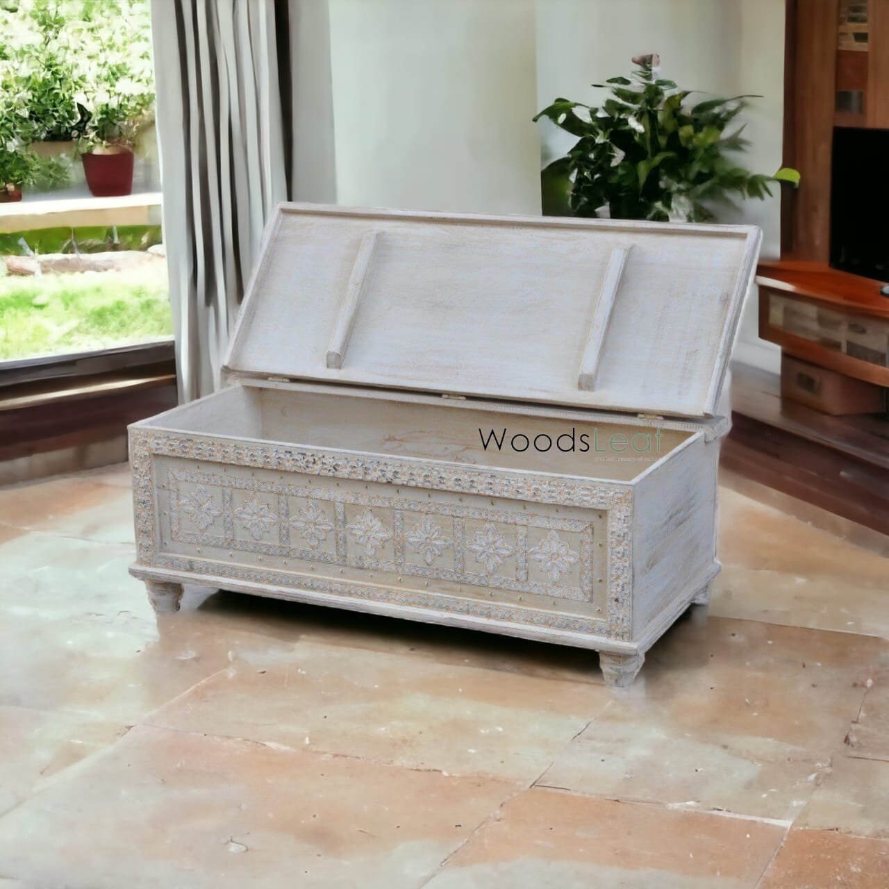 Decorative Element: Beyond its practicality, the hand-carved design and distressed finish make the trunk a decorative element in its own right. It can contribute to the overall aesthetics of your home and complement different interior styles.