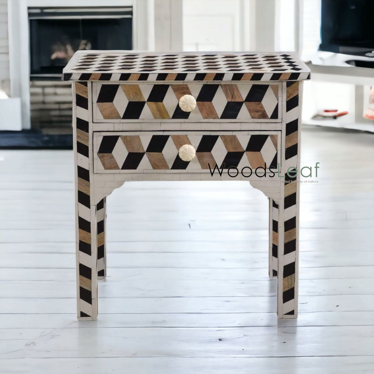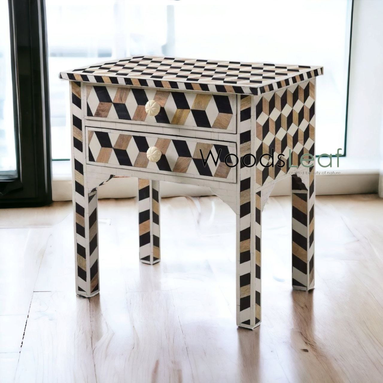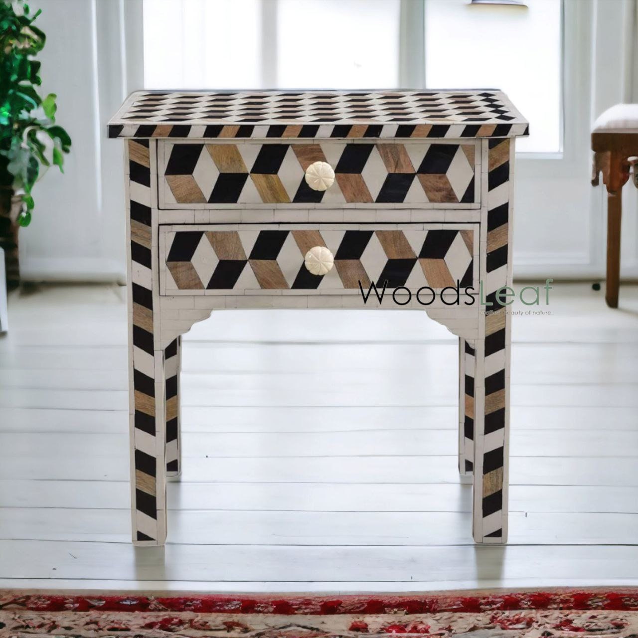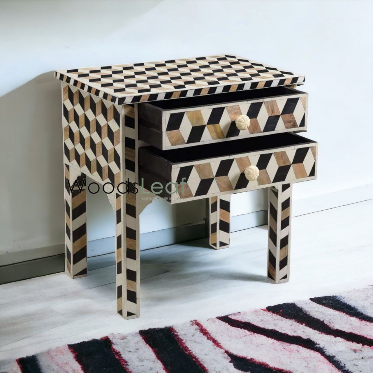 Bone and Wooden Inlay Nightstand with Black Resin Finish