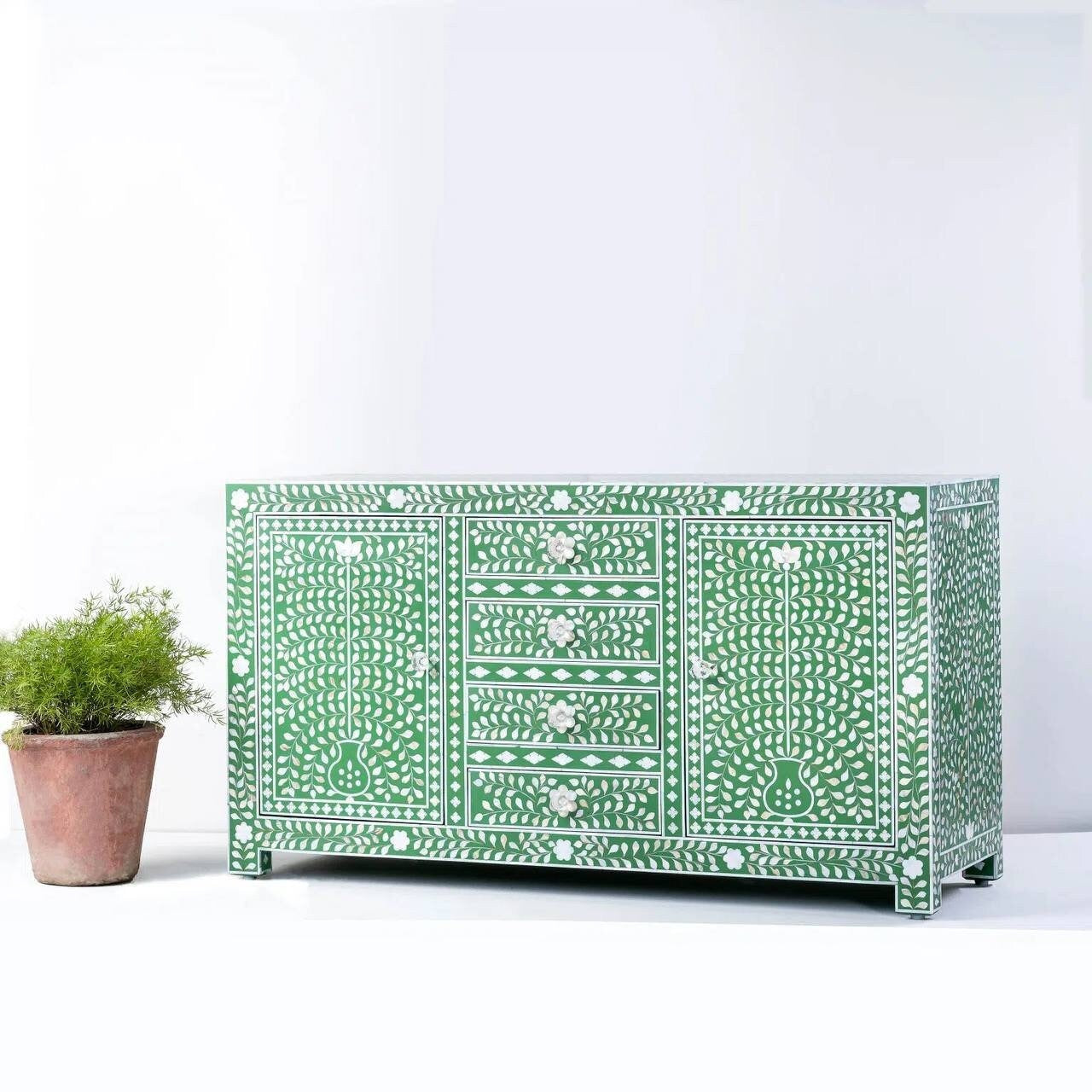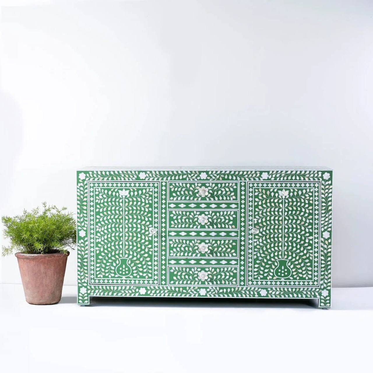 Green Resin Finish: Adding a contemporary twist, the bone inlay designs are accentuated with a captivating green resin finish. This finish not only enhances the intricacy of the bone inlay but also provides a durable and glossy appearance, elevating the cabinet's overall appeal.