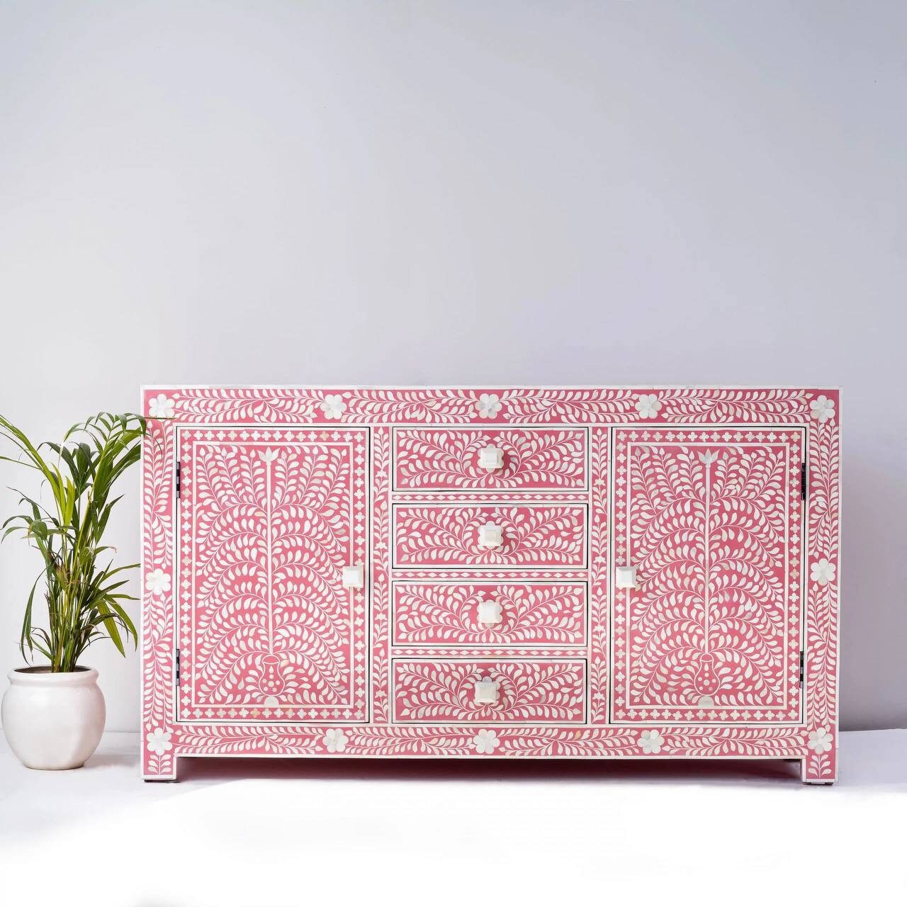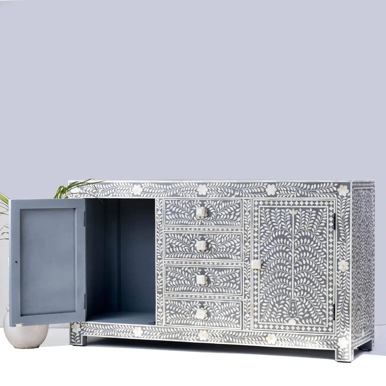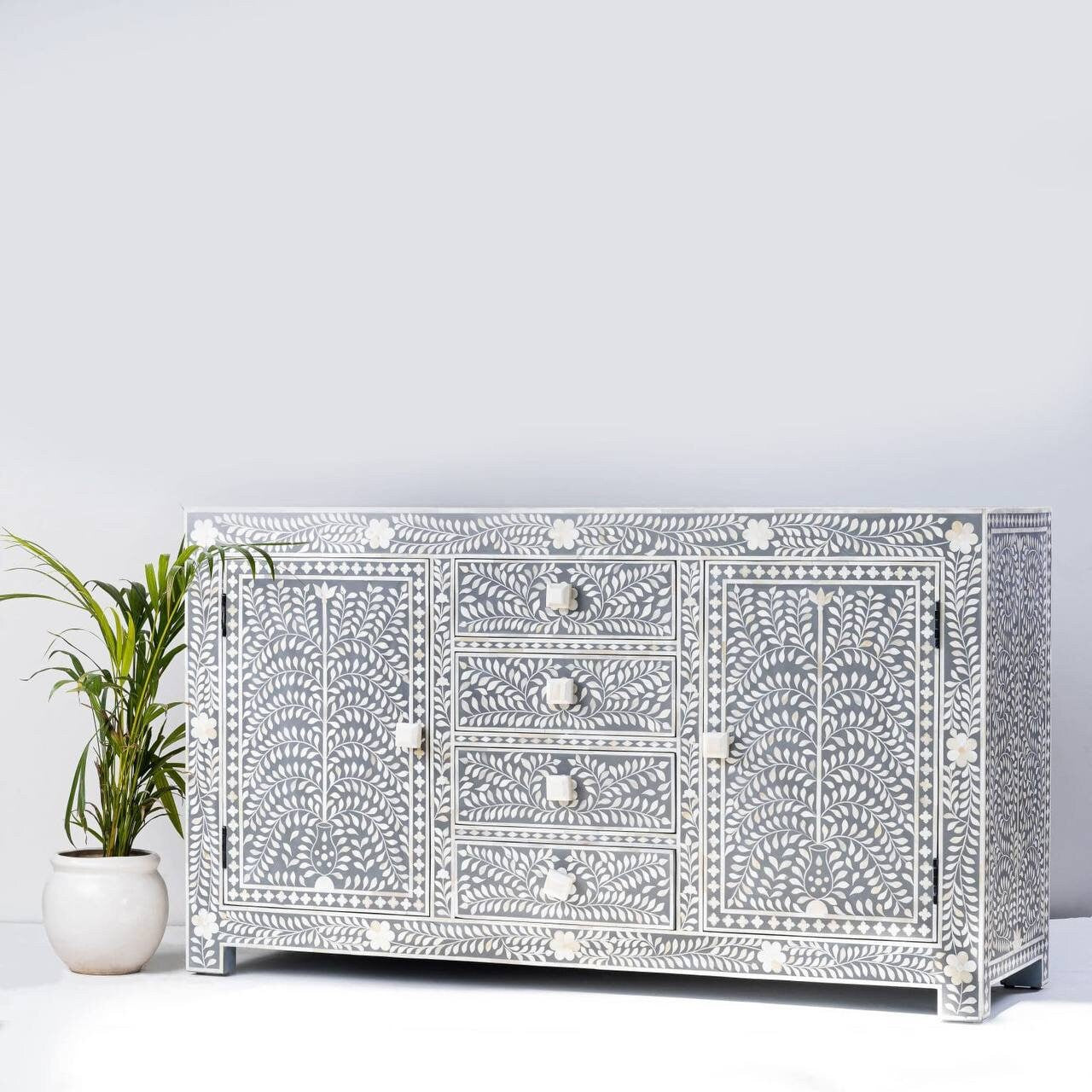 This exquisite Bone Inlay Cabinet is a testament to intricate craftsmanship and design. Constructed with durable Medium-Density Fiberboard (MDF), the cabinet not only promises longevity but also embodies elegance in every detail.