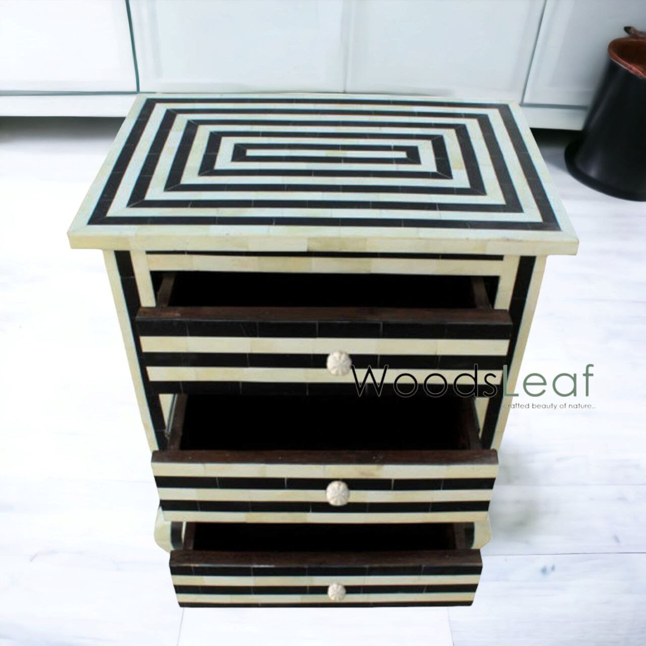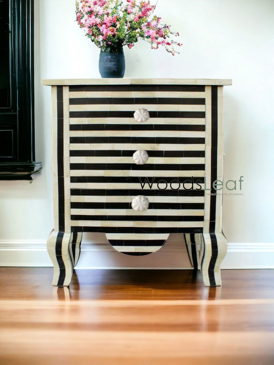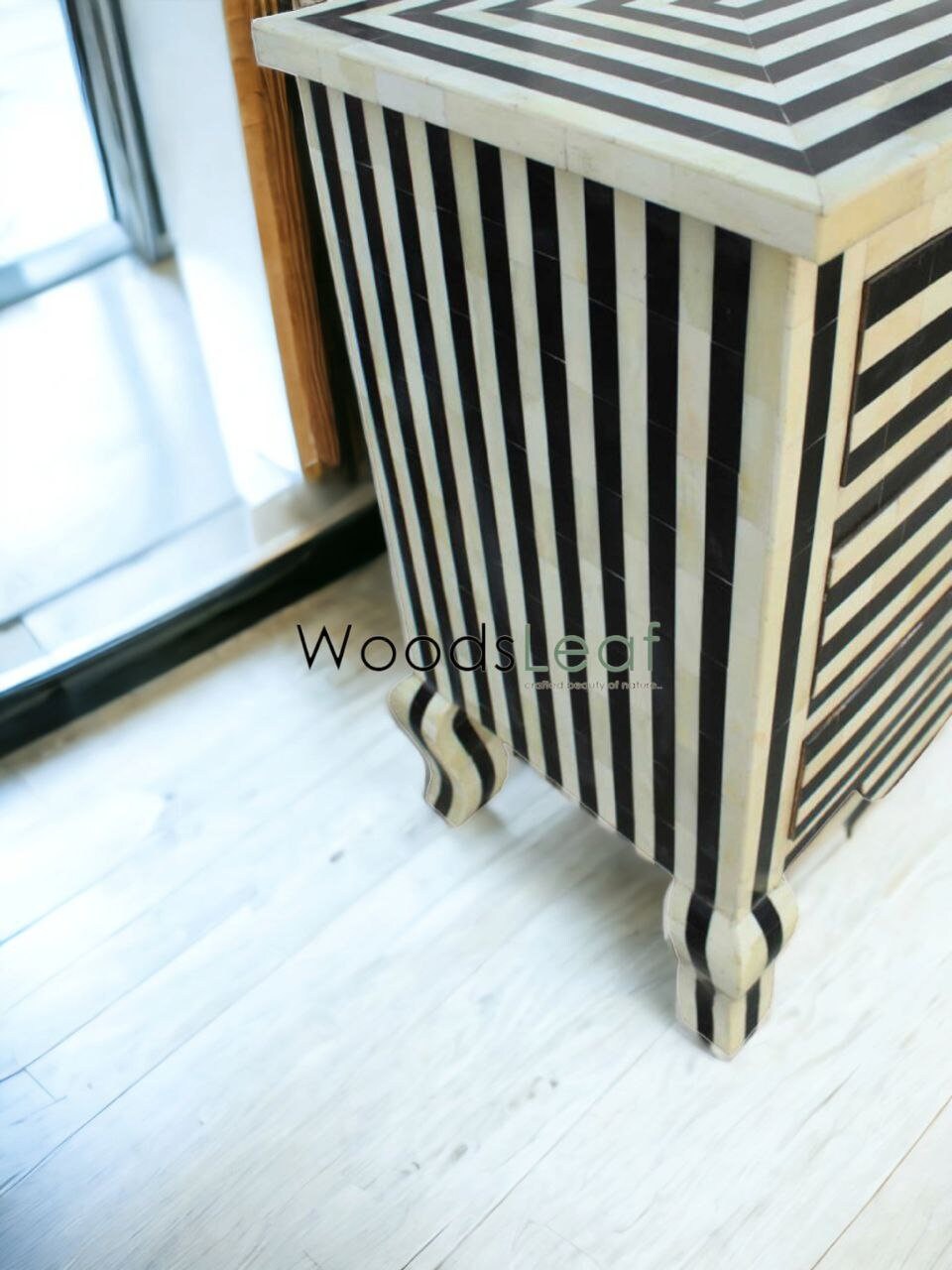 Elevate your bedroom décor with our exquisite Bone Inlay Bedside Table, meticulously crafted to combine beauty and functionality. Made from high-quality MDF, this bedside table showcases an intricate bone inlay design that adds a touch of sophistication to any space.