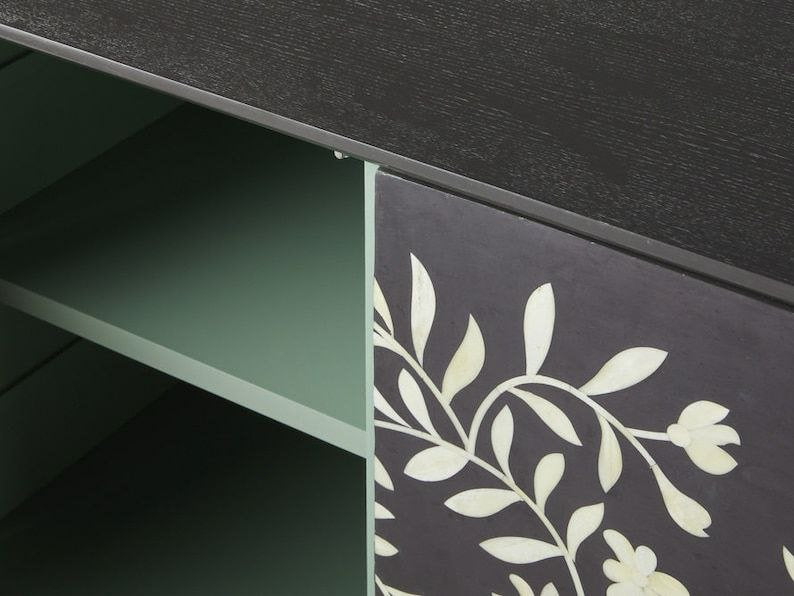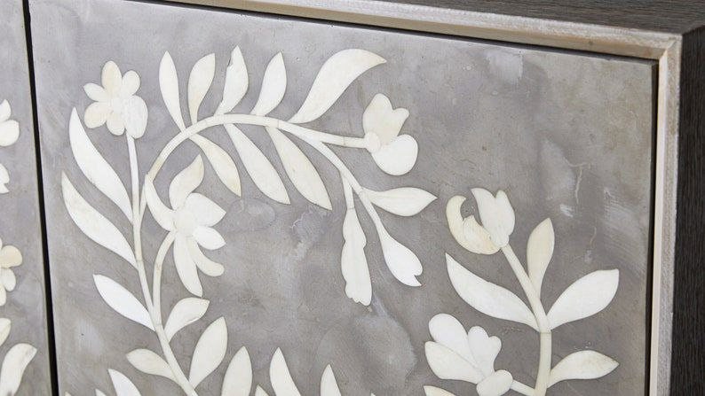 Design: The bone inlay design on the doors adds a touch of elegance and uniqueness to the sideboard. Each piece of bone is delicately cut and placed to create intricate patterns, making it a focal point in any room.