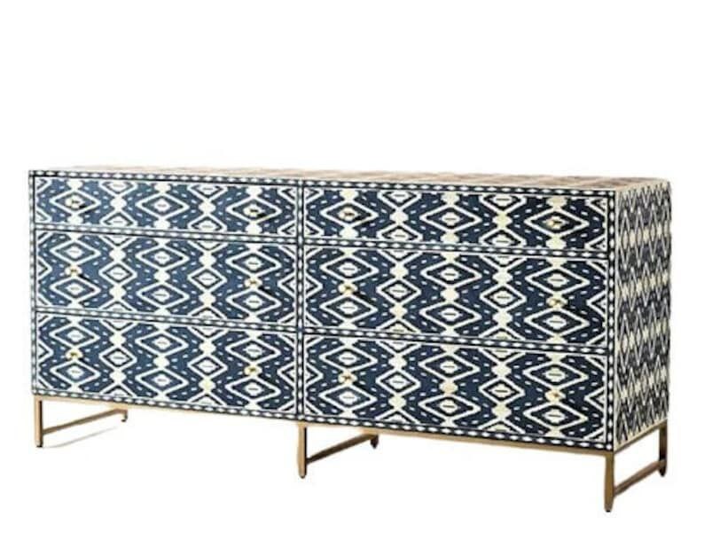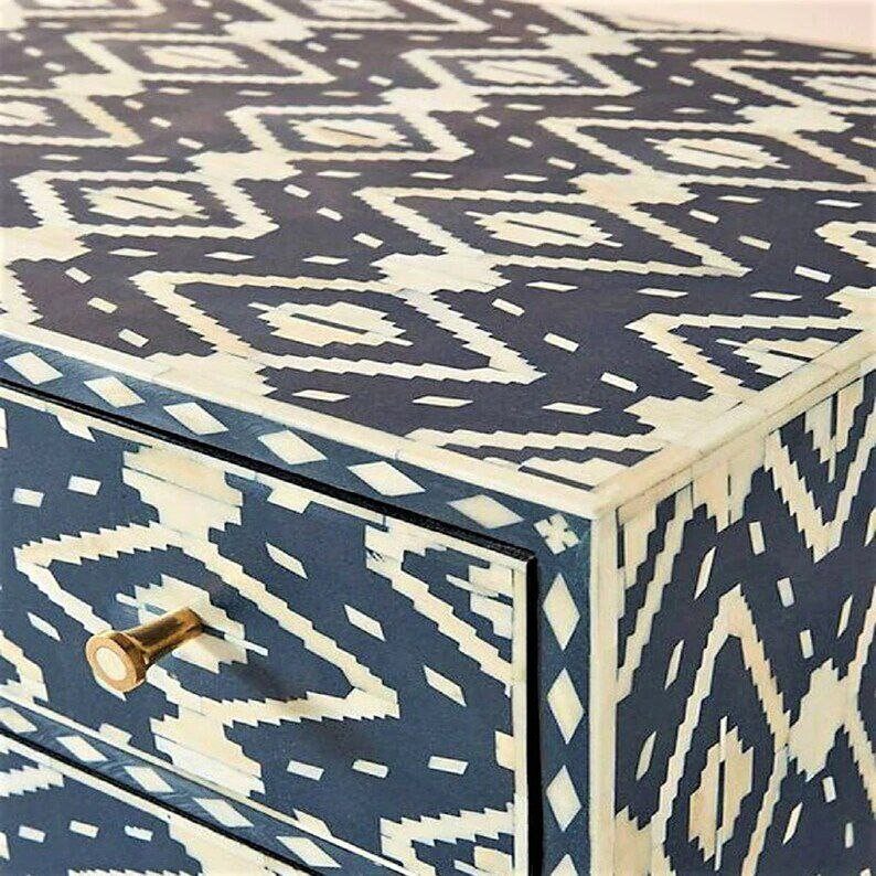 Overall, this Bone Inlay Chest of Drawer combines functionality with aesthetic appeal. The use of MDF provides durability, while the bone inlay design and golden accents contribute to its luxurious and elegant appearance. This piece would likely serve as a statement furniture item in any room, blending traditional craftsmanship with contemporary design elements.