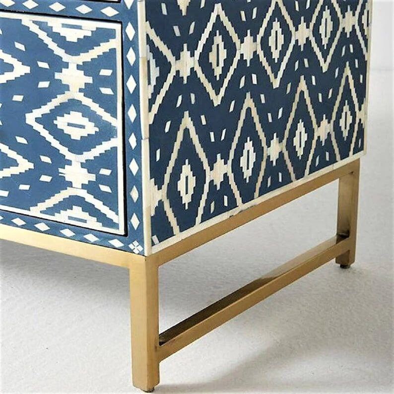 Design: The standout feature of this piece is the bone inlay design. Bone inlay involves embedding delicate pieces of bone into the furniture's surface to create intricate patterns or designs. Additionally, the blue resin finish adds a pop of color and further enhances the design's visual appeal.