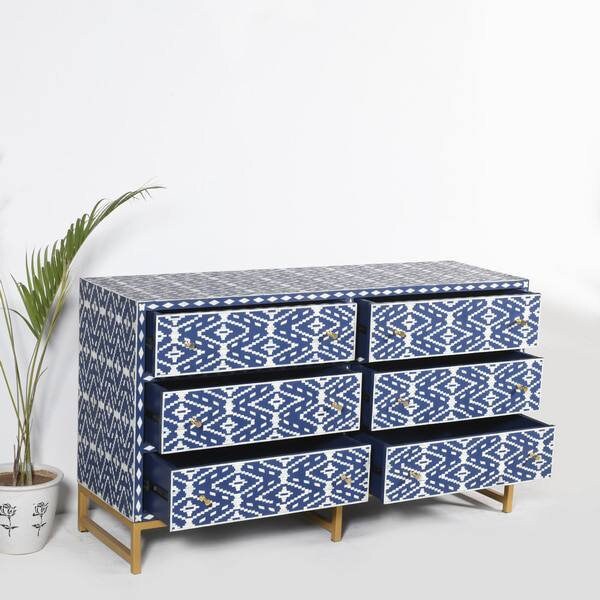 Blue Resin Finish: Complementing the bone inlay, the drawers are adorned with a blue resin finish. This finish enhances the overall aesthetic appeal of the piece, giving it a unique and contemporary look.