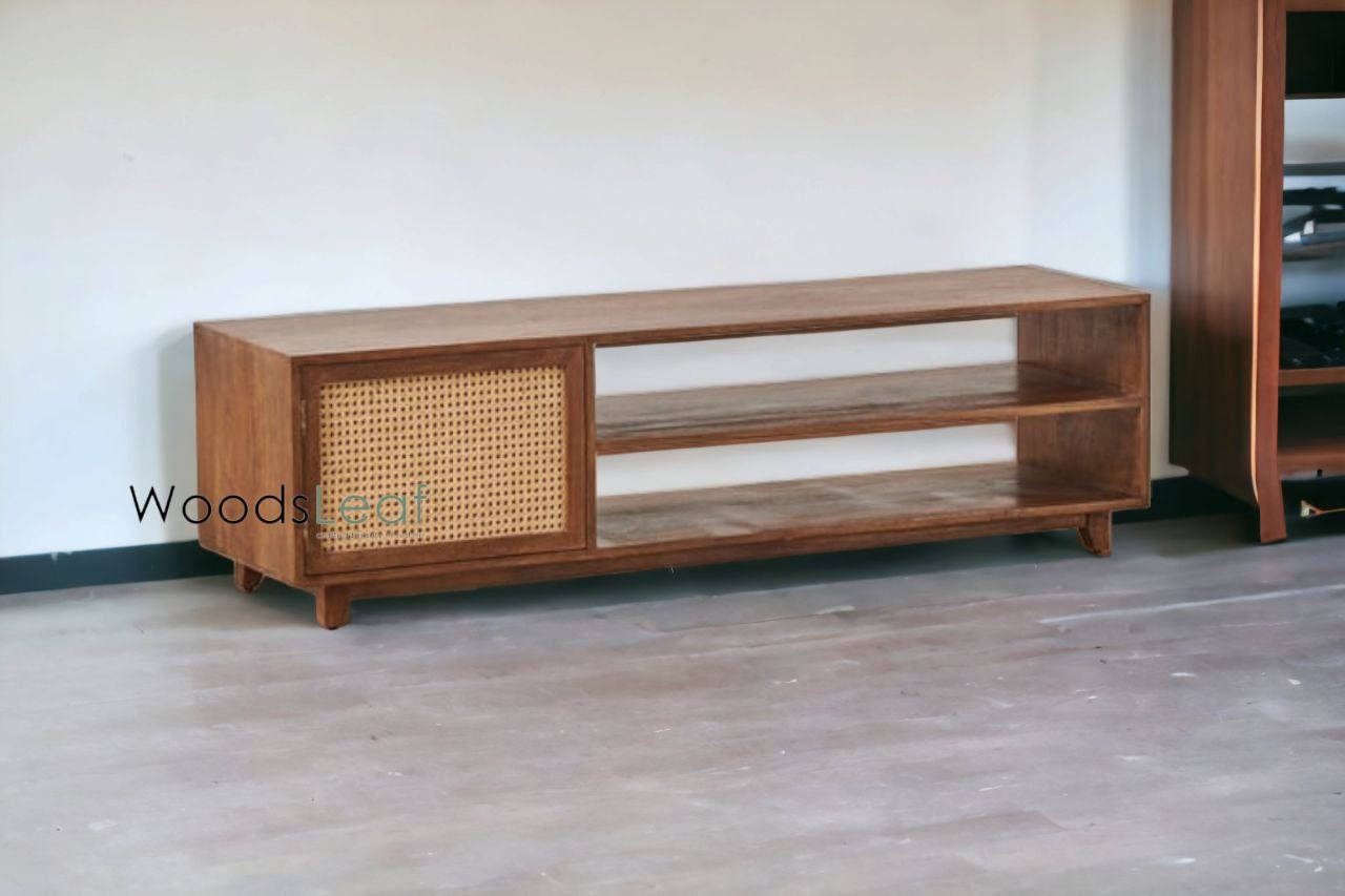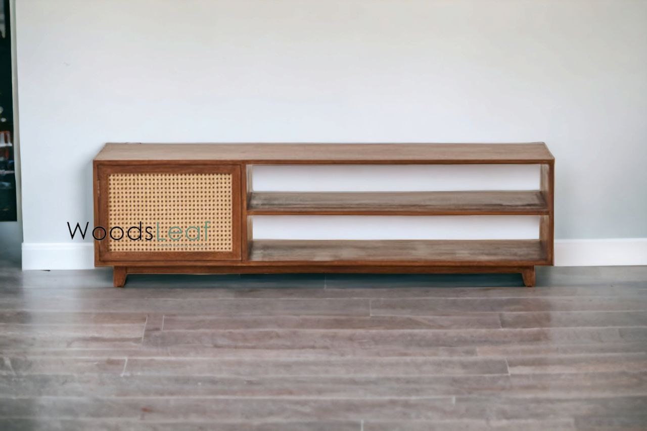 - Ideal for living rooms, bedrooms, or entertainment areas, this solid mango wood unit offers a blend of style and functionality. The combination of closed storage with the rattan door and open shelving ensures versatility, allowing you to showcase items while also keeping clutter at bay.