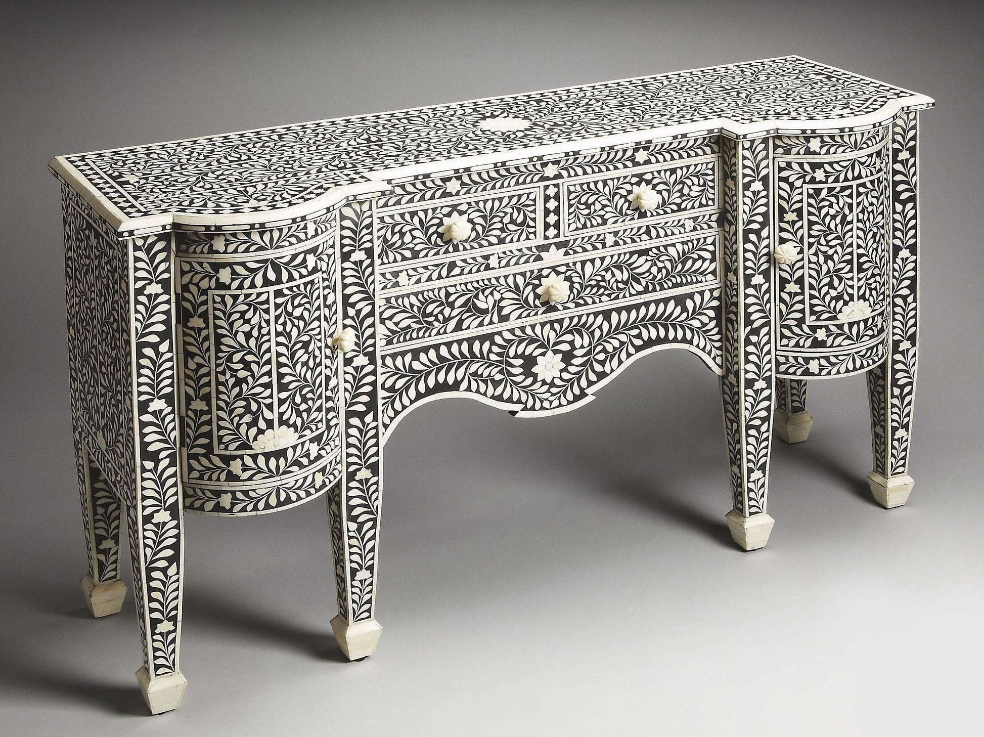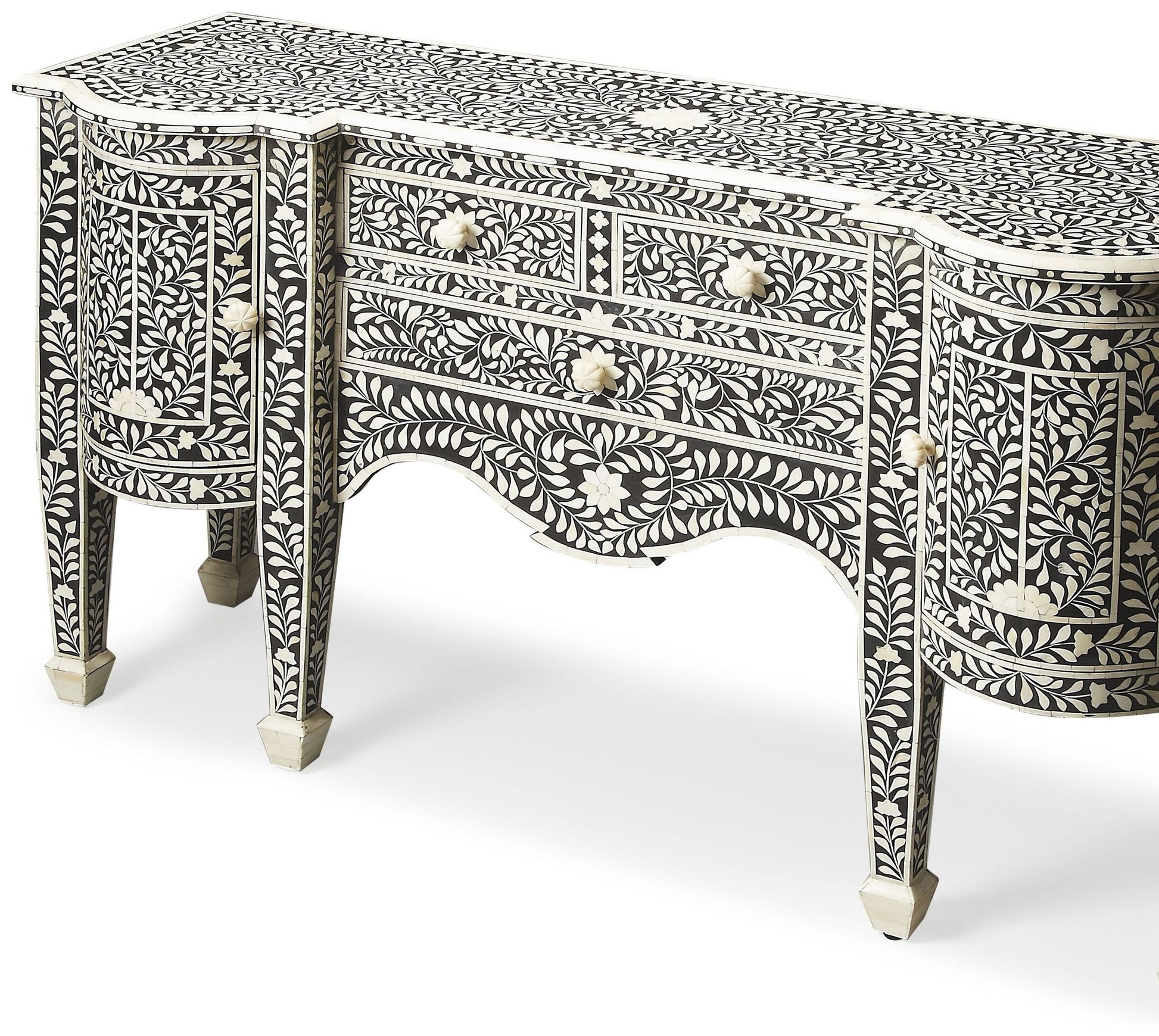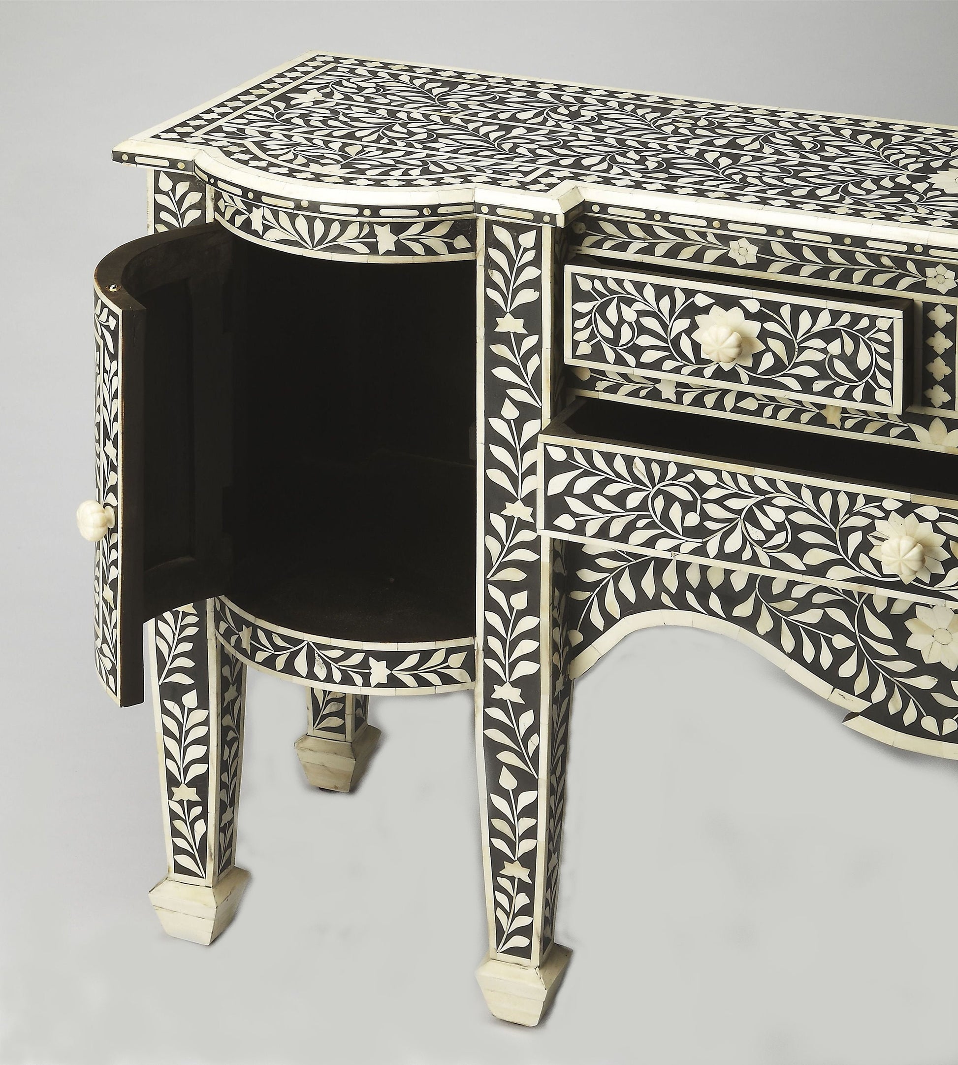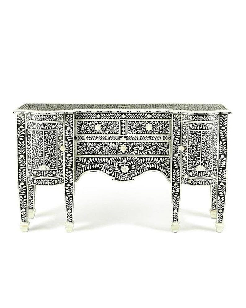 Constructed with high-quality MDF, this console table ensures durability while offering a smooth finish that complements the intricate bone inlay designs.