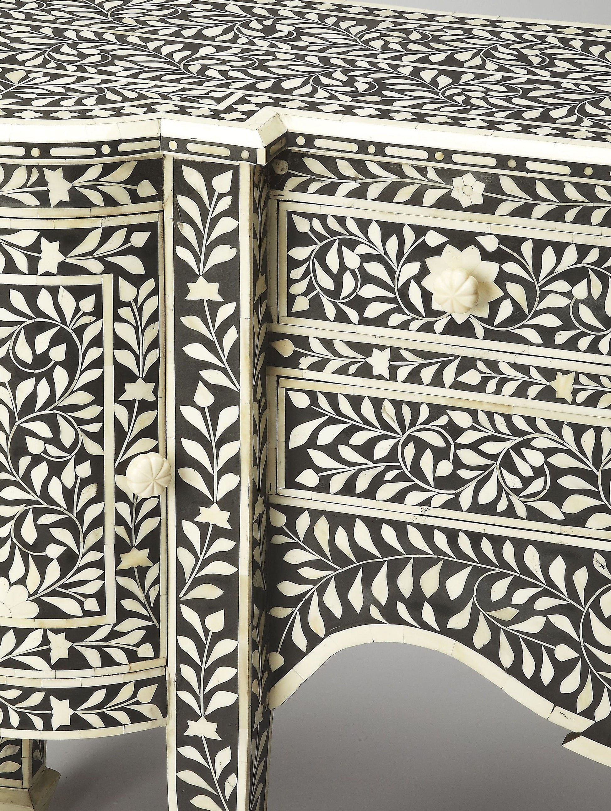 The Bone Inlay Console Table made from MDF combines functionality with artistic elegance. With its two storage compartments featuring beautifully designed bone inlay doors and matching knobs, along with three drawers adorned with complementary bone inlay designs, this console table stands as a testament to exquisite craftsmanship. The black resin finish serves as the perfect backdrop, enhancing the intricate bone inlay patterns and adding a touch of sophistication to any space it occupies. Whether placed in a living room, hallway, or any other area, this console table is sure to be a conversation starter, reflecting a blend of traditional artistry and modern design elements.
