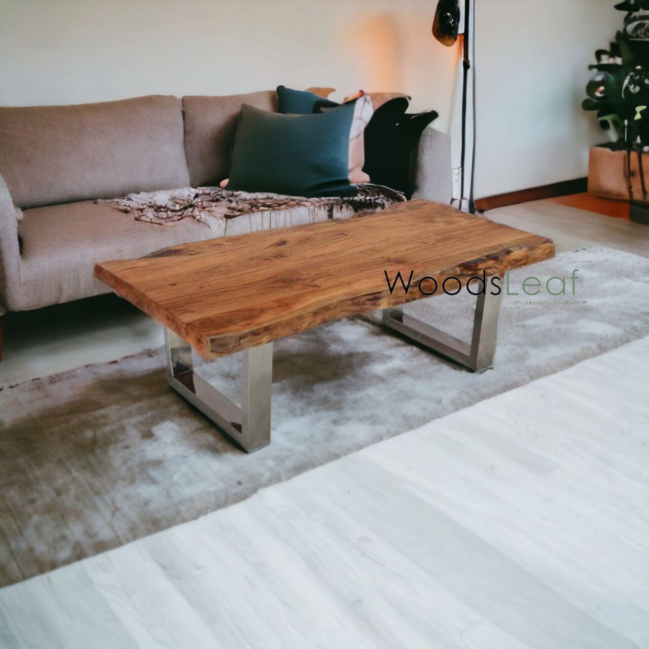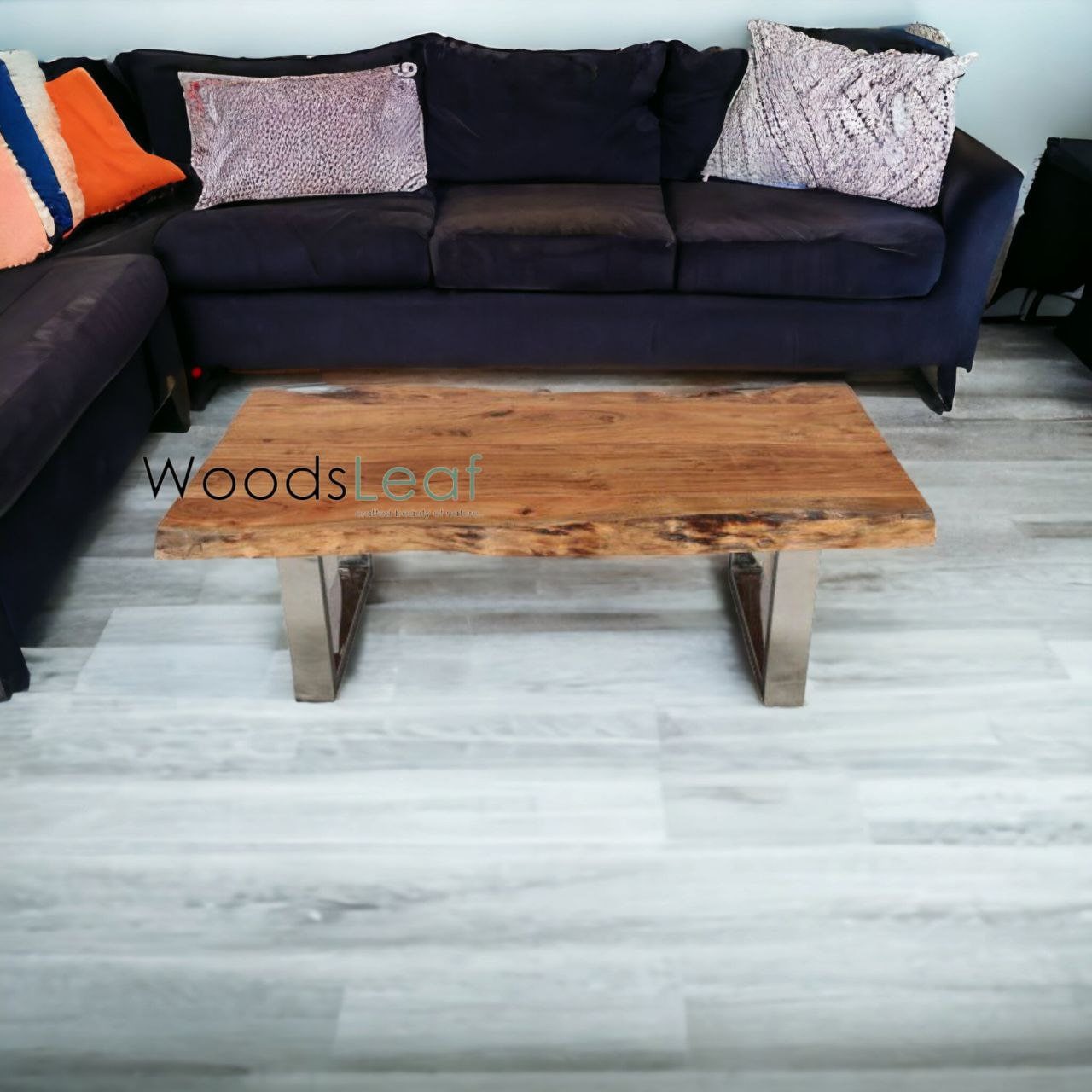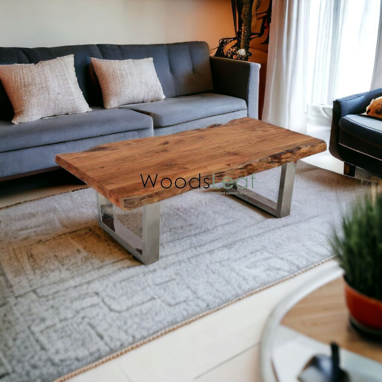 Solid Acacia Wood Coffee Table with Live Edge Table Top and Stainless Steel Base